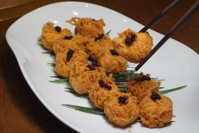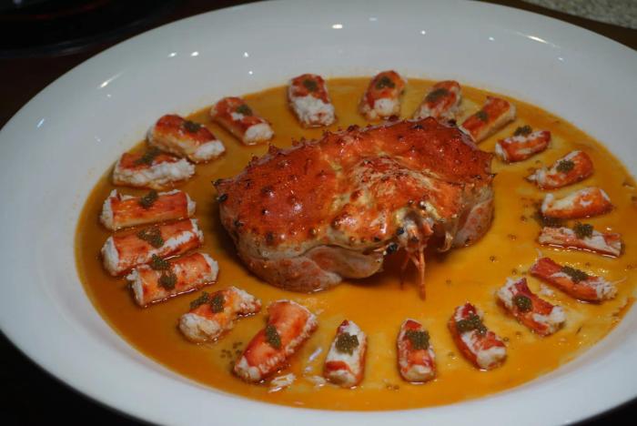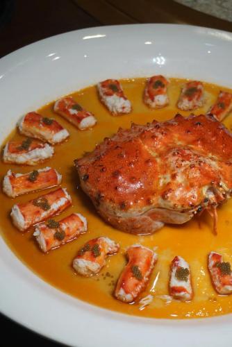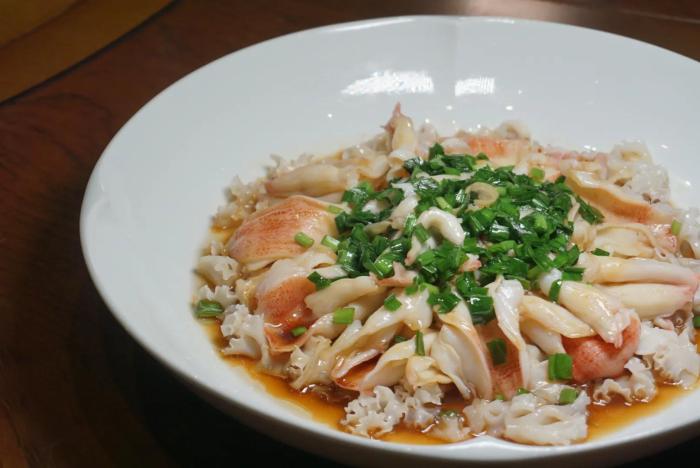 一蟹兩吃,前面帝王蟹身和海瓜子一起炒,已經是味蕾大大的重新整理驚喜。蟹腳每一隻都去殼,和芙蓉蛋一起蒸制。蛋液蒸到恰好,嫩嫩滑滑,一勺子蛋羹一塊蟹腳肉,豎起大拇指來誇的好味道!
