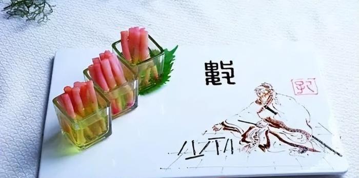 4. 裝盤;取慕斯包入糯米紙,插入有番茄辣椒的管子裝飾即可