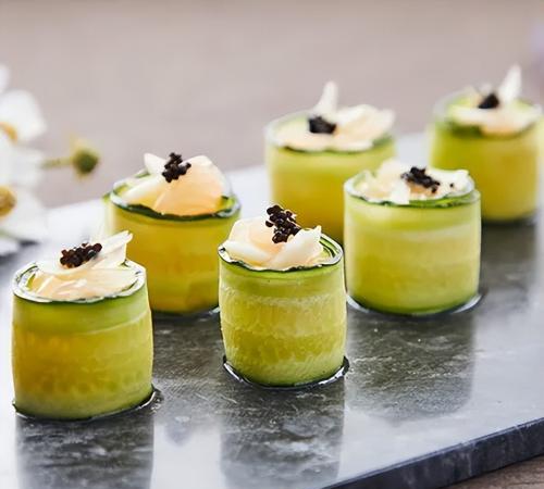 2. 柚子肉撕小塊與鮮百合,調味料拌勻。用黃瓜片包裹裝盤後點綴魚籽醬即可。