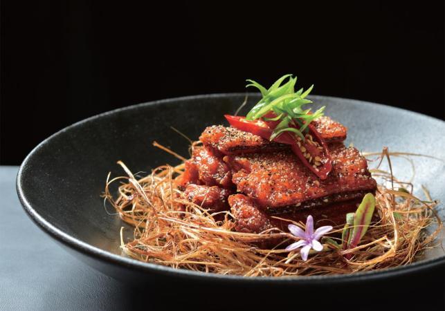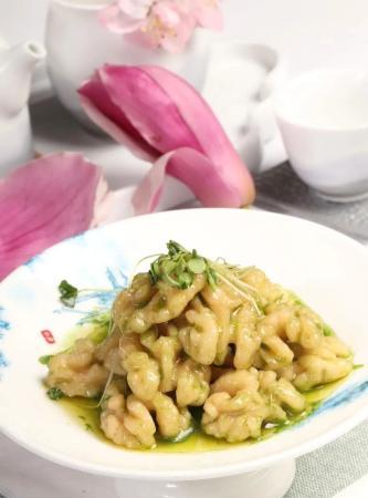 “椒麻核桃仁”“茴香苗桃仁”風靡一時,此菜乍看與之頗為相似,實際上卻是將香椿頭與香椿苗絞碎,再拌入桃仁,成菜入口清新,略帶回甘,十分解膩。