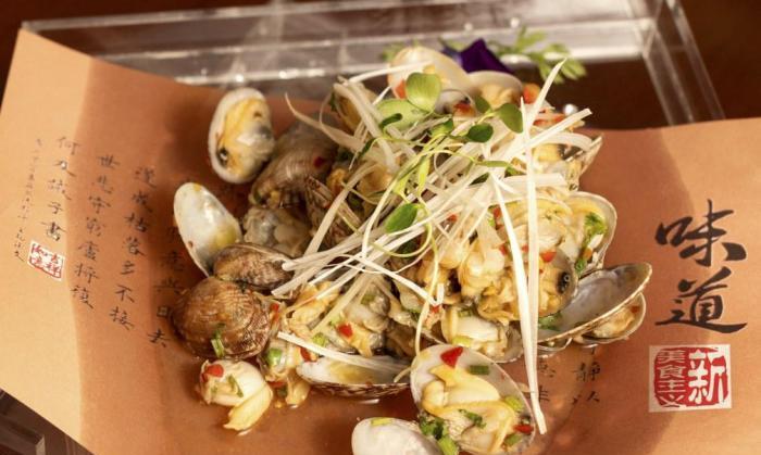 2.將雞汁、一品鮮醬油、香醋、糖、香油、藤椒油、木姜油調成味汁,加入花甲、小米椒碎、蒜泥、香菜梗碎拌勻,裝盤撒蔥白絲,稍加裝飾即成。