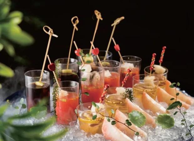 2. 將熟鴨舌、熟八爪魚、熟豬耳片分別用竹籤穿上藠頭、藕丁、醬油蒜片、玉女瓜丁,再分別泡入洗澡泡菜汁、酸辣番茄汁、山椒汁中。脆桃用洗澡泡菜汁泡1小時至入味,將其分裝在小杯子裡,擺入冰盤,再擺上脆桃,放上海葡萄,稍點綴即可。