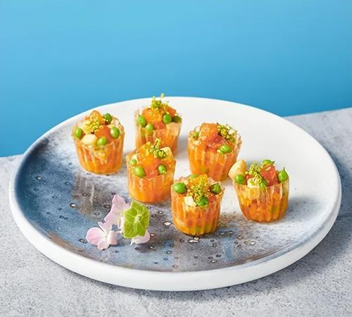 4. 將三文魚粒、茭白粒、甜豌豆加調味料拌勻,裝入水晶簪中裝飾花苗即可。
