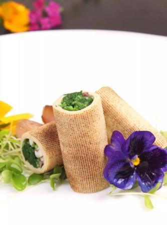 3.調好的薺菜香菇餡兒倒在豆腐皮上,卷緊成圓筒狀,抹上少許蛋清封口,上籠蒸5分鐘,晾涼後改刀成3厘米長的段,裝盤時,點綴豆苗、花瓣、煳蔥節,根據食客需要,帶辣味或甜味蘸碟上桌。