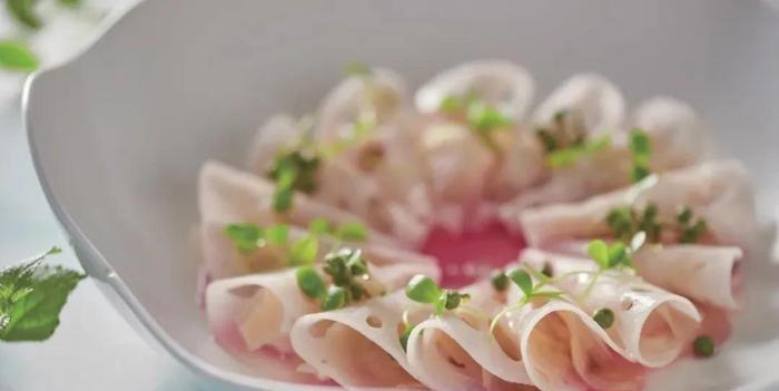 4.走菜時將耳片夾入藕片中層層疊好,在盤中圍擺一圈,淋上胭脂色泡菜水、藤椒油,用鮮青花椒、可食用花草點綴即成。
