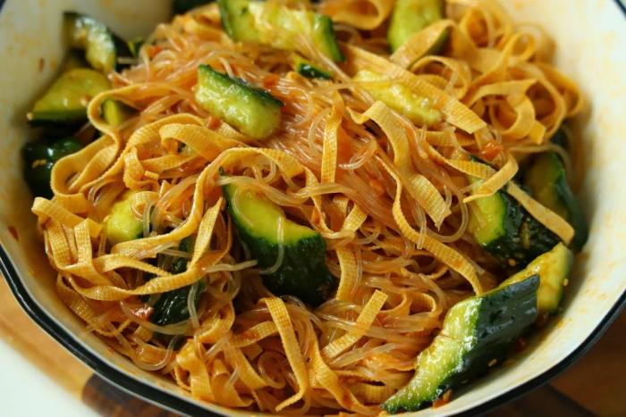 製作配料:粉絲1扎 千張1個 黃瓜1根