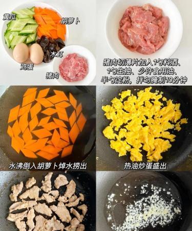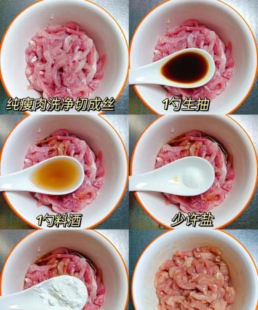 - 木耳,胡蘿蔔,青椒切絲,豬肉切絲加鹽,一勺生抽,一勺料酒,半勺澱粉抓勻醃製10分鐘