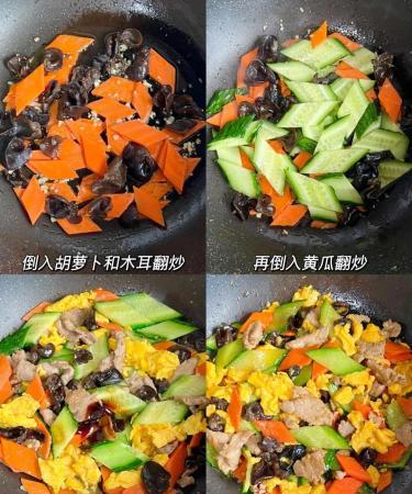 - 倒入胡蘿蔔和木耳翻炒,再倒入黃瓜翻炒