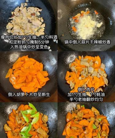 - 鍋中蒜片幹辣椒炒香,倒入胡蘿蔔翻炒至斷生,再倒入肉片➕1勺生抽、1勺蠔油、半勺老抽翻炒均勻