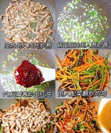 - 鍋中倒油,放入肉絲炒熟盛出來,蔥蒜炒香加入一勺豆瓣醬,炒出紅油