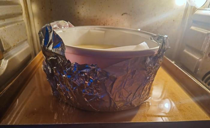 第四步:把模具外面用錫紙包住,烤盤上放少許水,用水浴的方法烤制這款乳酪蛋糕,烤箱200度預熱5分鐘,改成上下火155度,把模具放入烤盤中,加入少許水,水浴大約50分鐘即可。
