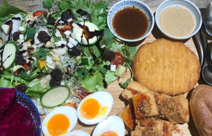 - 必點!就是最傳統的組合,豆包、素香腸、滷蛋、配菜等,一個就飽足。